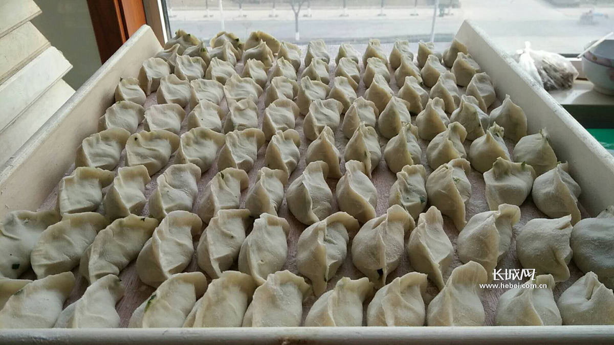 经过老年公寓的工作人员几个小时的努力,一盘盘饺子码放整齐,等待下锅。颐康老年公寓供图
