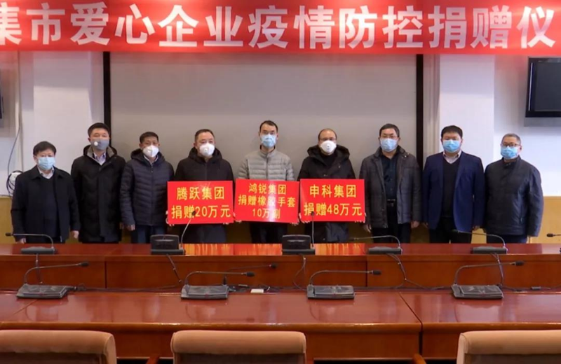 为感谢各家企业对当前疫情工作的关心和支持,1月30日,辛集市举办爱心企业疫情防控捐赠仪式,并分别为申科集团、腾跃集团、鸿锐集团授牌。据了解,申科集团此次捐赠人民币48万元,助力打好疫情防控攻坚战。腾跃集团为支持辛集市做好新冠病毒的防控工作,捐款20万元。鸿锐集团作为医疗防护企业,春节期间组织全体干部职工加班加点,已向疫区平调发送医疗防护手套800万只,此次又捐赠10万副手套。