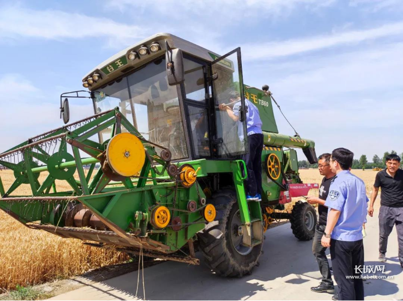 6月11日,在田家庄乡南付庄村,市农业农村局农机安全监理站的工作人员正在对收麦的农机手进行安全指导,叮嘱大家要严格按规范操作,切不可轻心大意,避免发生农机安全生产责任事故。