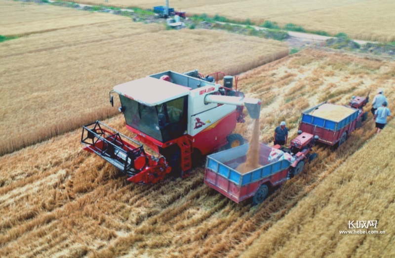 和睦井乡贾辛庄村,收割机在麦田作业。辛集市融媒体中心 供图