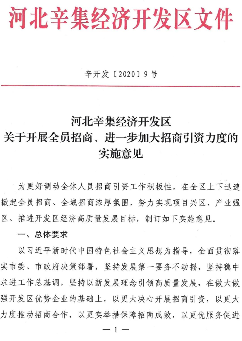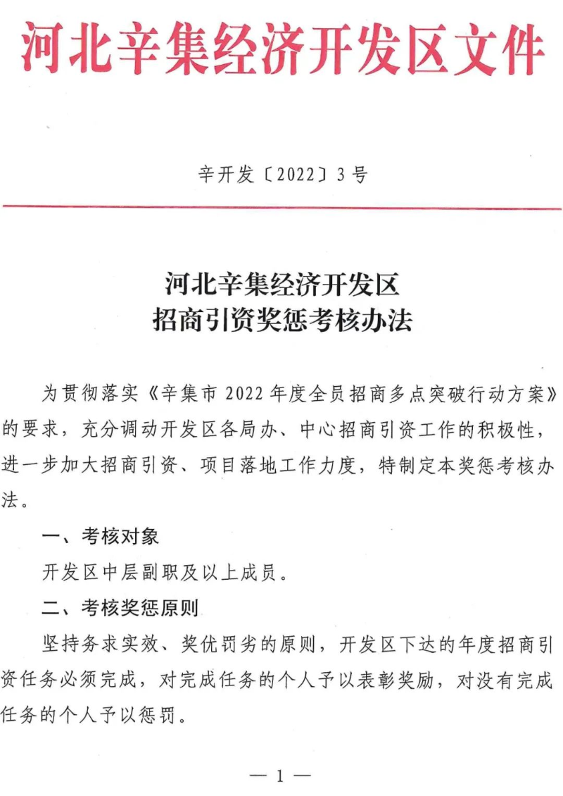 经济开发区出台了《河北辛集经济开发区关于开展全员招商、进一步加大招商引资力度的实施意见》《河北辛集经济开发区招商引资奖惩考核办法》,确定了小团组招商、精准招商、闭环招商工作思路,按层级明确了招商任务,招商成绩与考核奖惩挂钩,营造了人人谈招商、人人跑项目的生动局面。今年以来,全区共收集有效信息112条,总投资227.89亿,其中区领导收集信息33条、中层干部收集信息53条、一般干部收集信息26条。