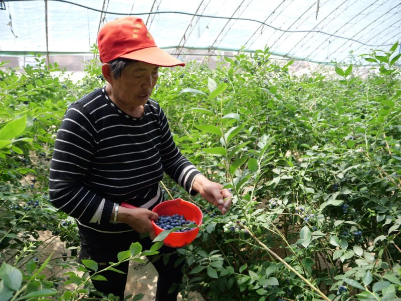 在蓝莓大棚里,拇指大小的蓝莓果上挂着白霜,处处果香四溢,一簇簇颗粒饱满、色泽纯正的蓝莓缀满枝头,工人们正忙着采摘分拣装箱。