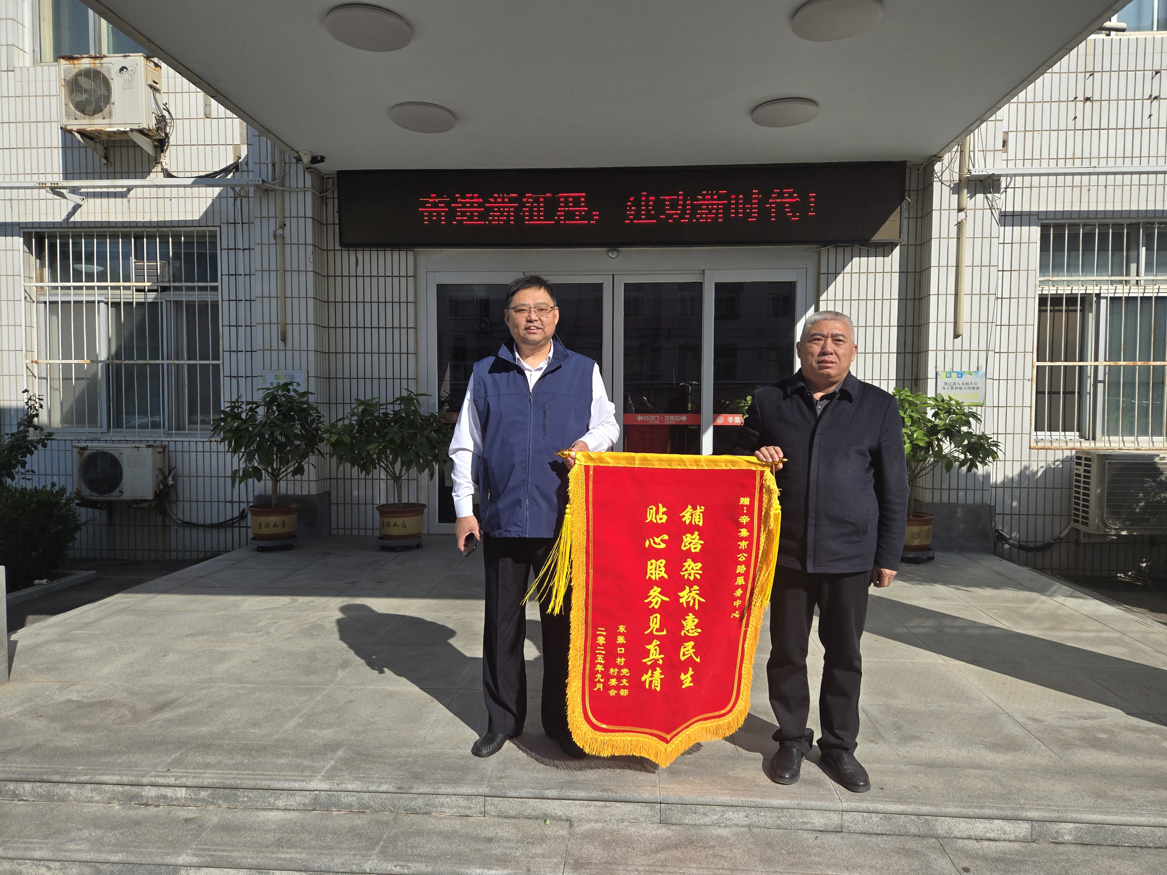 双面锦旗,双份谢意。10月14日,市公路服务中心迎来了特殊的客人——东张口村党支部书记一行。他们专程前来,将写有“交通畅达引鸿程,局务精勤惠众生”和“铺路架桥惠民生,贴心服务见真情”的锦旗分别赠予交通运输局和公路服务中心。锦旗鲜红,村书记笑容朴实,言语中满含感激,动情诉说着农村公路升级改造后村里发生的喜人变化。