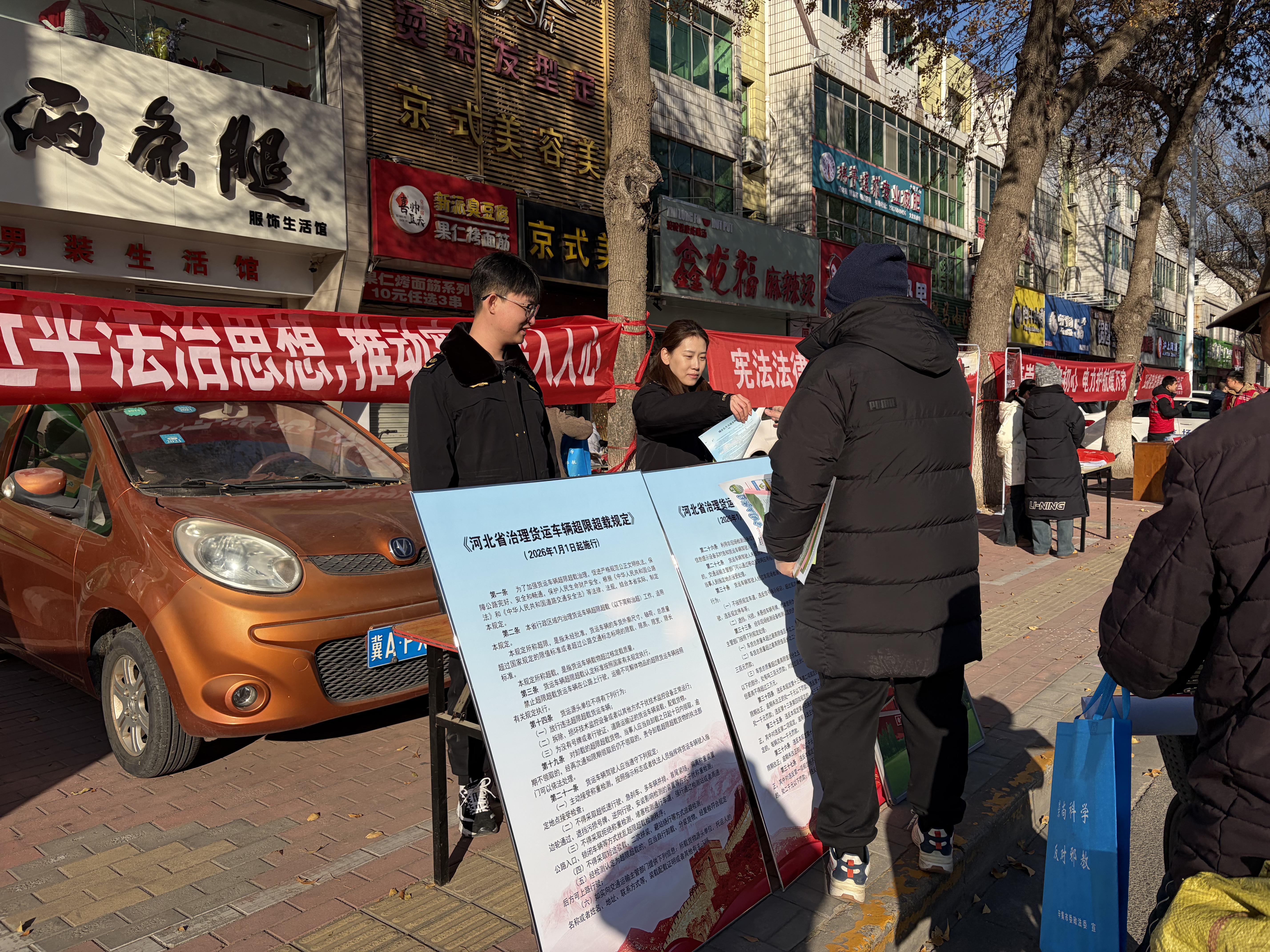 活动现场,市交通运输局通过悬挂主题横幅、摆放普法展板、发放各类普法宣传手册等形式,向过往群众阐释宪法核心要义及《中华人民共和国公路法》《中华人民共和国道路运输条例》《河北省治理货运车辆超限超载规定》等与群众日常出行密切相关的法律法规。此外,设置了“一对一”法律咨询台,针对群众关心的交通运输领域法律问题提供了专业、细致地解答服务。据统计,本次活动累计发放宣传资料500余份,接受现场咨询群众12人次。