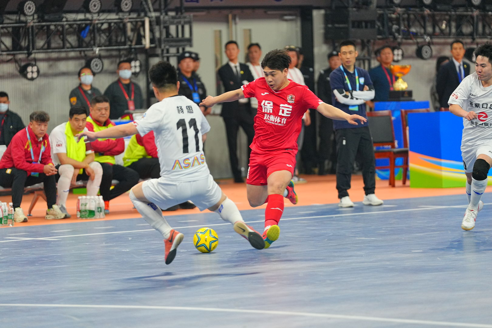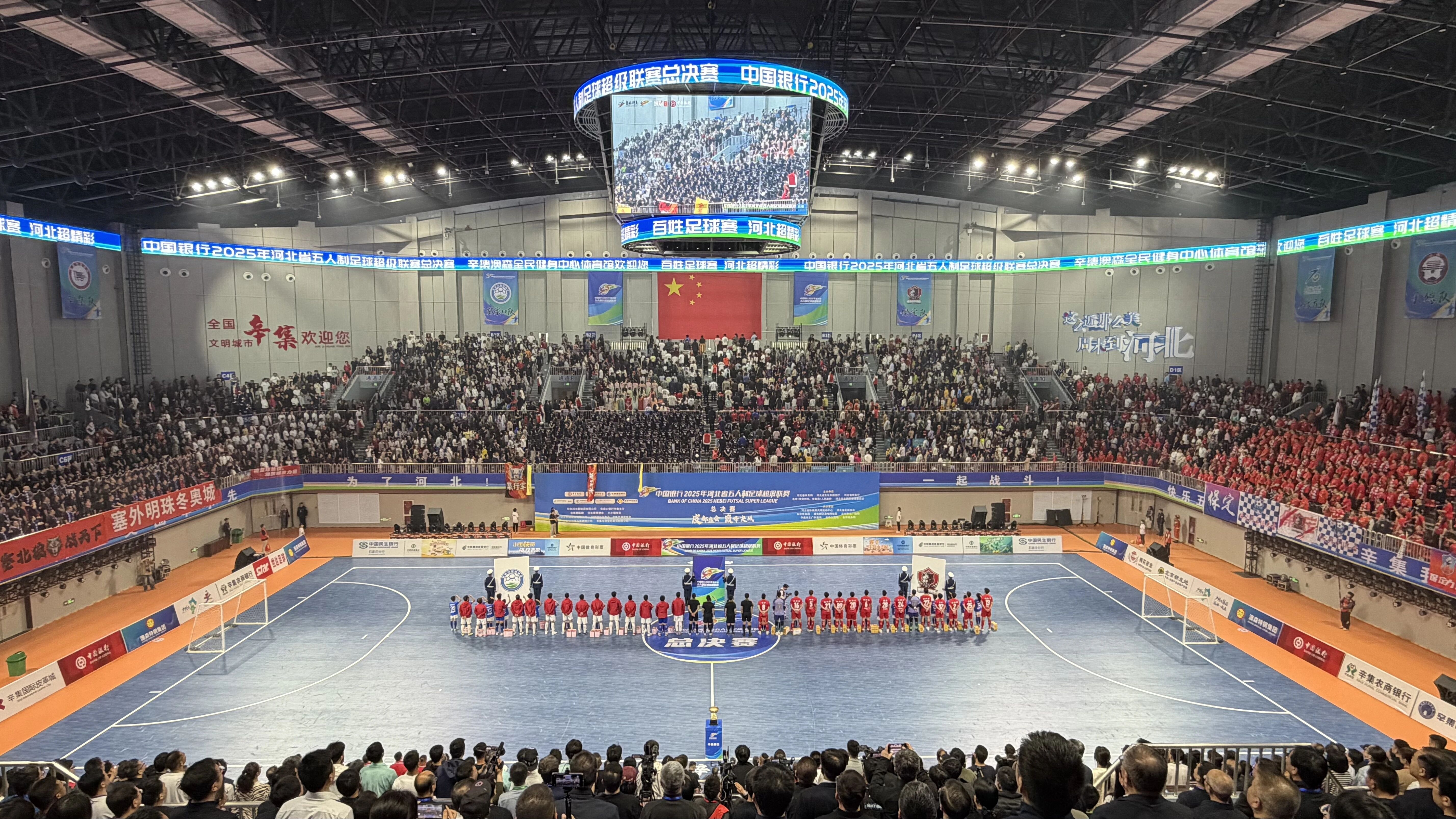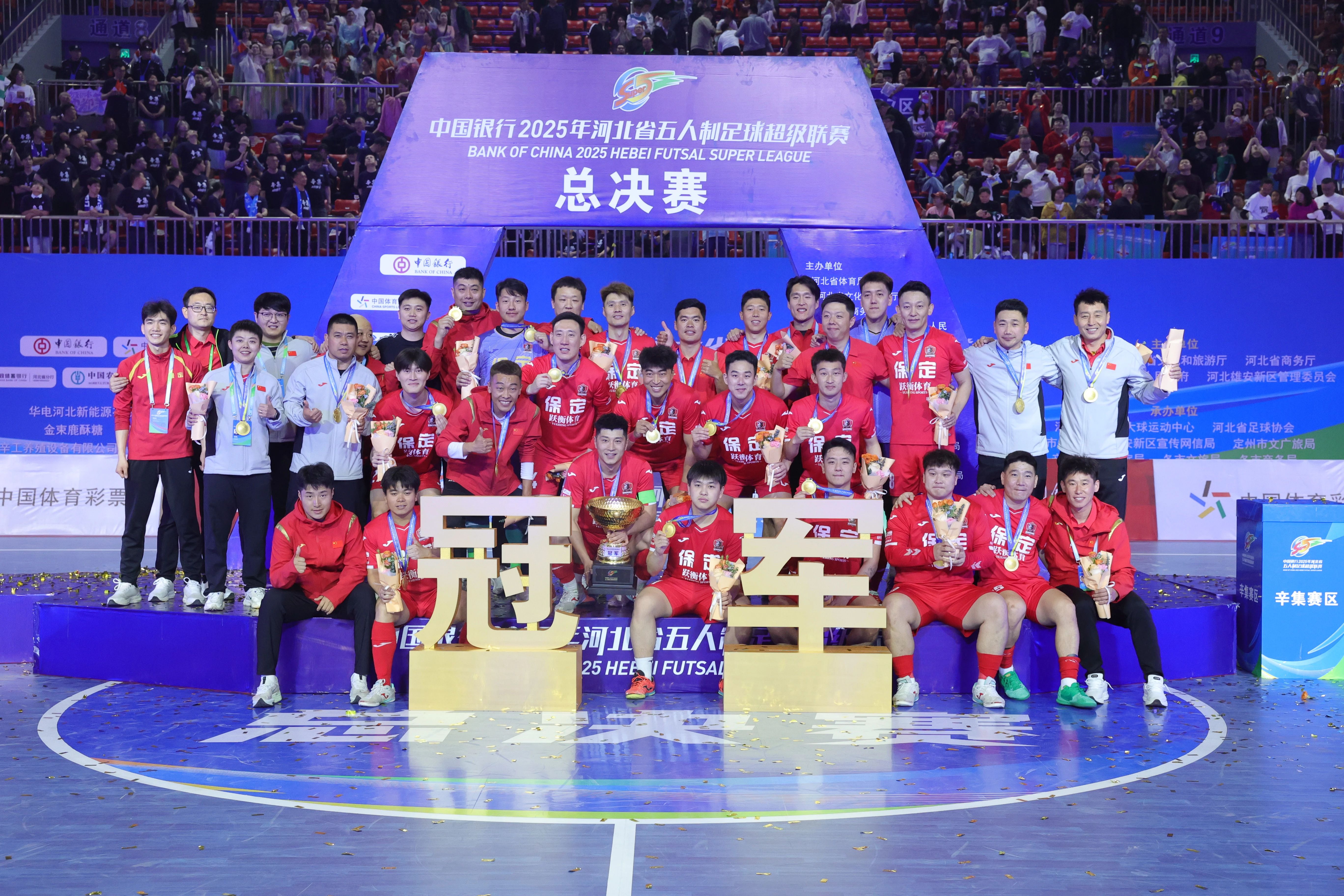4月12日晚辛集市澳森全民健身中心——主馆(体育馆)灯光璀璨、座无虚席,备受瞩目的“河北五超”总决赛迎来终极对决,4200名球迷齐聚现场,共同见证这场足球巅峰之战。经过60分钟鏖战,保定队以5:1战胜张家口队成功斩获首届“河北五超”冠军,为这场横跨9个月的绿茵盛宴画上完美句号。